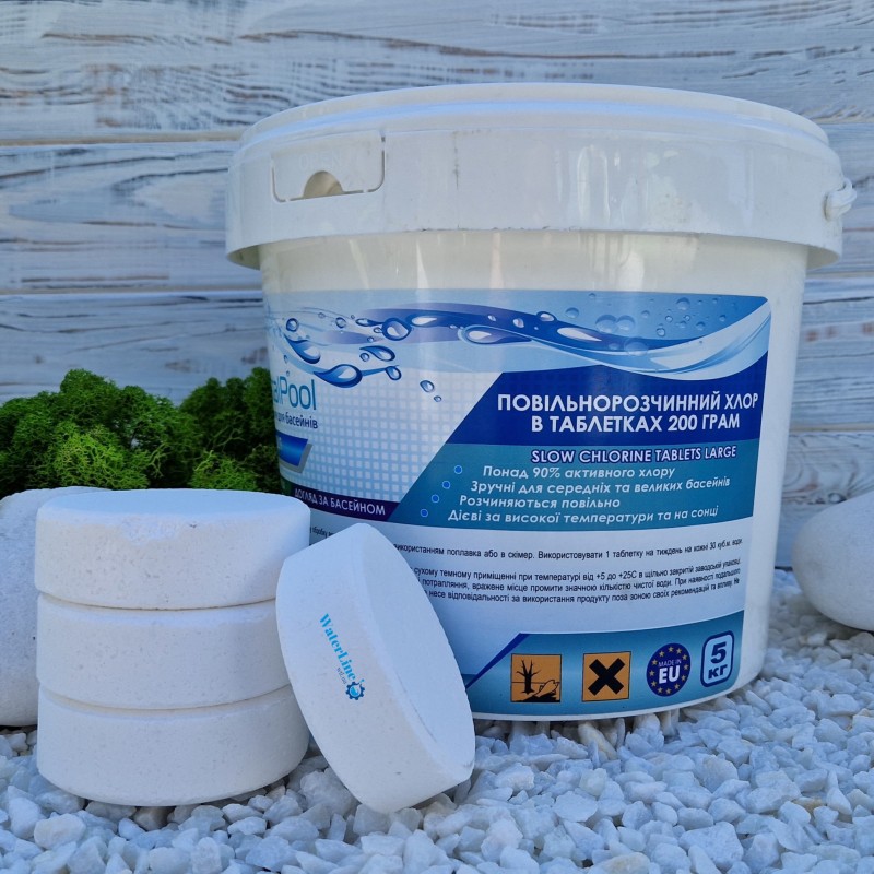 Медленный (длительный) хлор для бассейна Crystal Pool Slow Chlorine Tablets 5 кг большие таблетки для бассейна